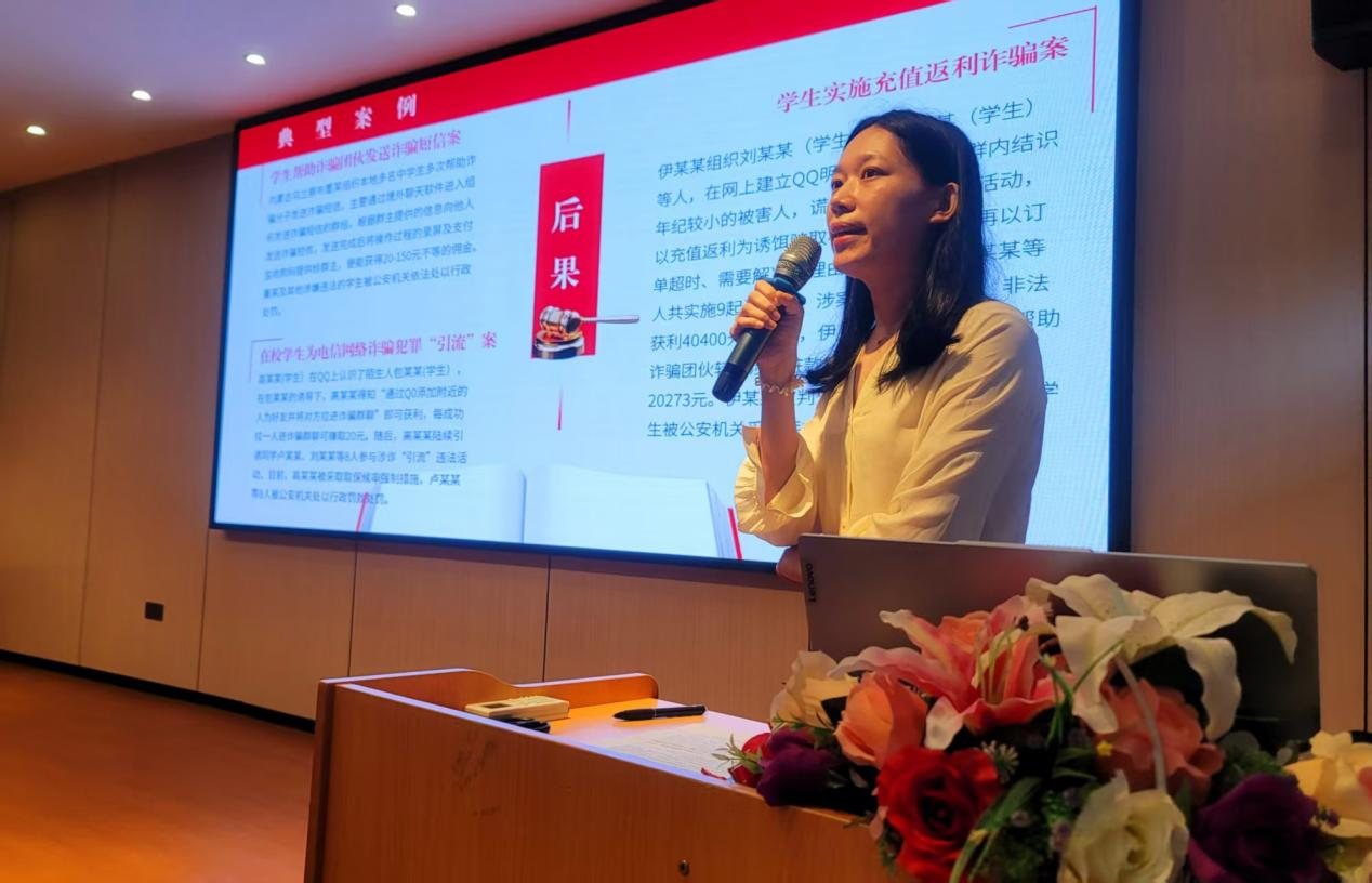 林玲首先代表学校,对赣州市公安局反诈中心、中国人民银行赣州市分行、赣州银行三家单位的精心组织与专业分享表示热烈欢迎和衷心感谢,感谢各部门心系学生成长,为同学们带来贴合校园生活的反诈与金融安全知识。她希望全体同学珍惜此次学习机会,认真聆听、积极互动,将所学知识牢记于心,随时提高警惕,既要筑牢自身反诈“防火墙”,也要争当校园反诈“宣传员”,守护好自己和同学的财产安全。
