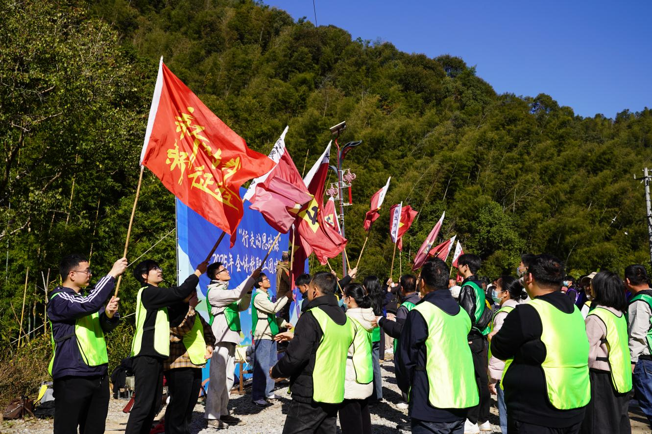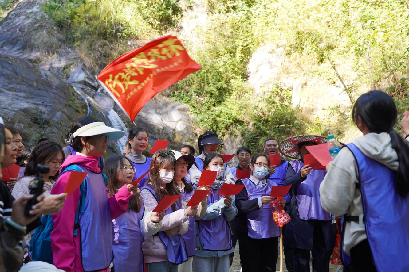 在团建教练的有序组织下,全体教职工迅速分成6支队伍。一场充满激情与协作的团队竞赛正式拉开帷幕。蜿蜒的犹崇古道草木葱茏,每一寸土地都镌刻着革命先辈的奋斗印记。教职工们沿着先辈们曾经跋涉的山路缓步前行,脚下的石阶凹凸不平,仿佛在诉说着当年的艰难岁月。大家相互搀扶、彼此鼓劲,在“身体在场”的行走中,真切体会红军战士不畏艰险、坚韧不拔的长征精神 。行至开阔处,红色家书诵读、红歌二重唱的旋律应声而起,《梅岭三章》响彻山谷,《红星闪闪》经典嘹亮的歌声既是对革命先辈的深情致敬,也是红色信仰在新时代的铿锵回响,让“行走的思政课”更具感染力与穿透力。