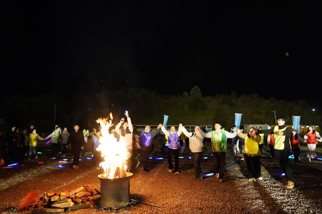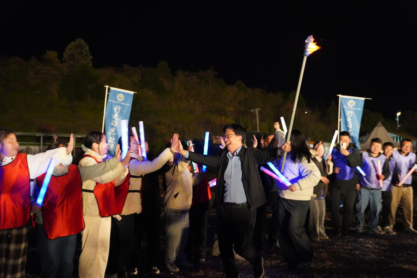 夜幕降临,姚学林亲自点燃篝火,并与全体教职工一一击掌互动,温暖的瞬间让团队友谊在火光中愈发浓厚。教职工们挥动着手中的荧光棒,载歌载舞,尽情释放工作压力。