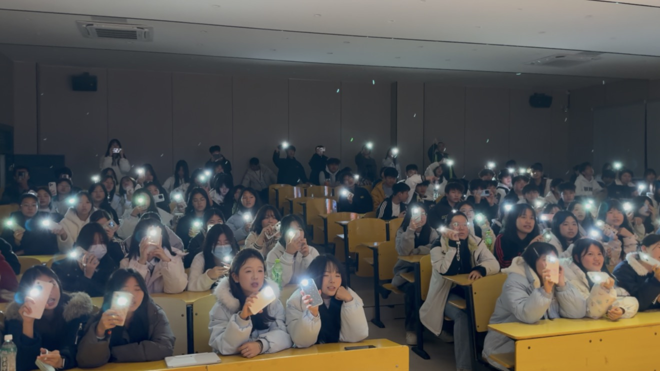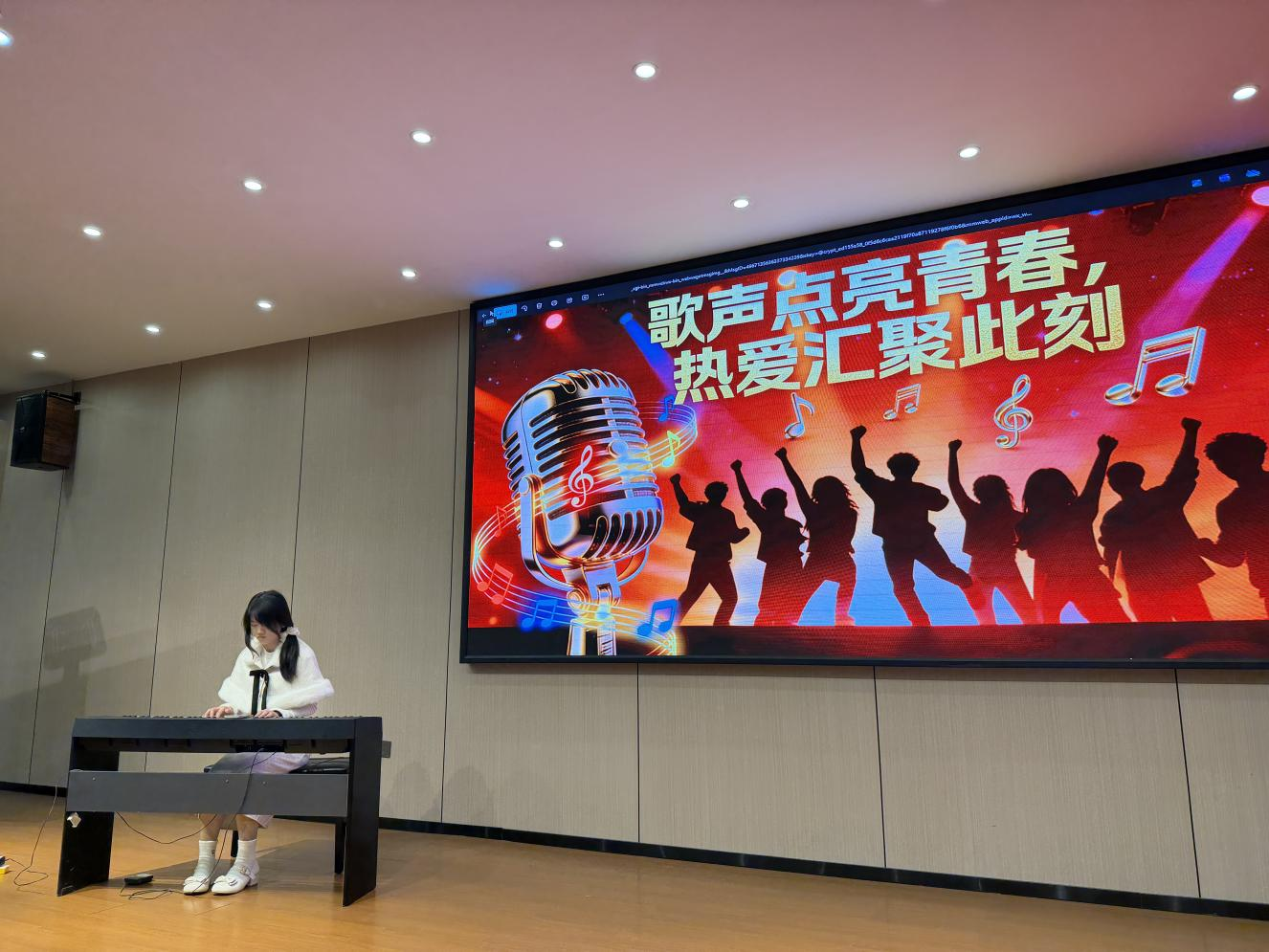 “音为有你,乐动青春”活动中,吉他社、合唱队、钢琴社联袂登台,即兴弹奏温暖悠扬,点歌合唱互动热烈,歌词接龙、猜歌名等小游戏妙趣横生,全场师生挥舞手机闪光灯,共同唱响青春旋律。