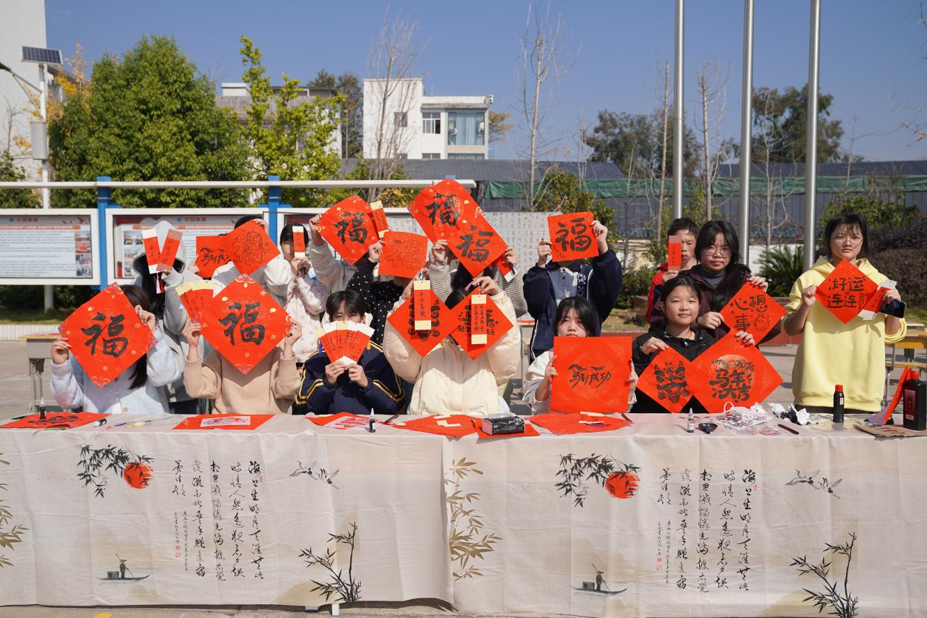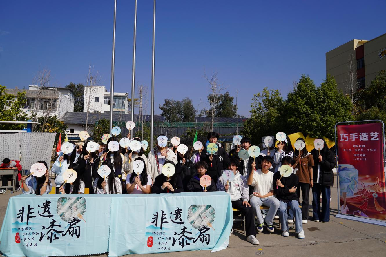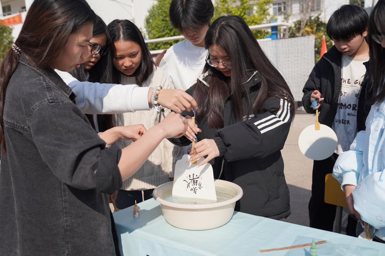 “笔墨传情·巧手造艺”活动则充满传统文化气息,书法社指导学生书写“福”字、手工社制作非遗漆扇,一件件饱含巧思的作品跃然眼前,尽显传统文化魅力。