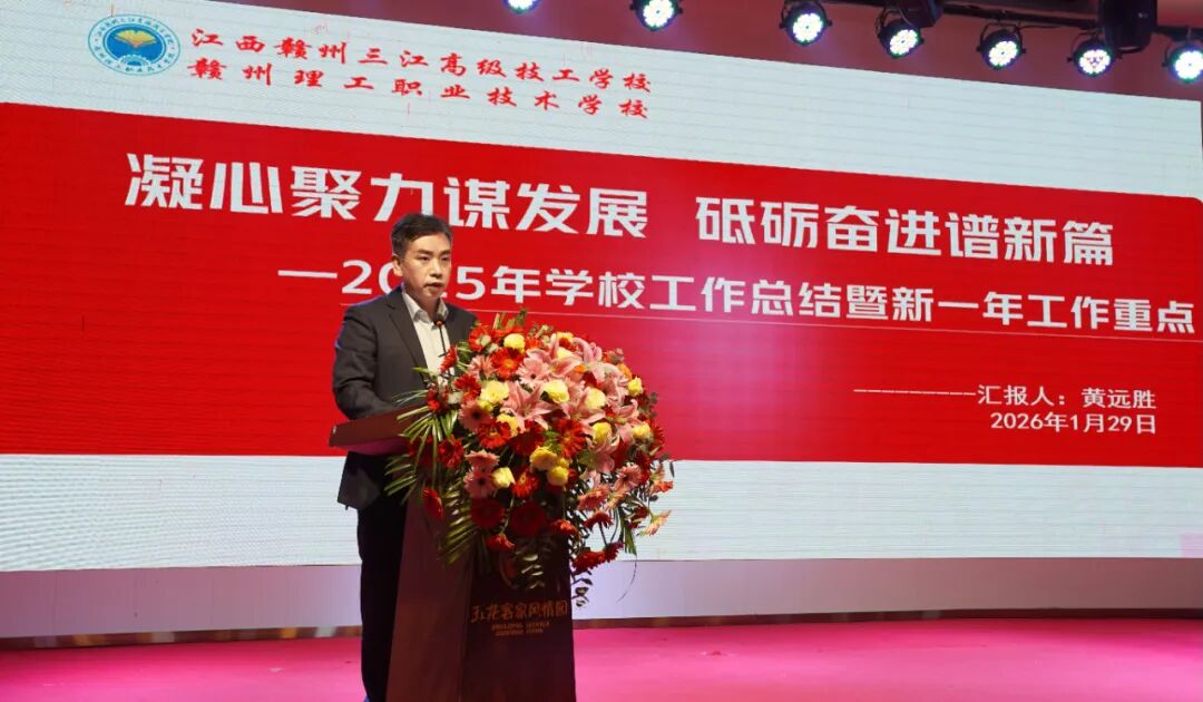 黄远胜在2025年工作报告中全面回顾了过去一年的办学成果,客观分析了发展中面临的机遇与挑战。同时,明确2026年发展蓝图,要聚焦生源稳定与质量提升,强化师资队伍建设,完善心理健康教育体系,规范实习就业管理,拓宽校企合作广度深度,全方位推进学校内涵式高质量发展。