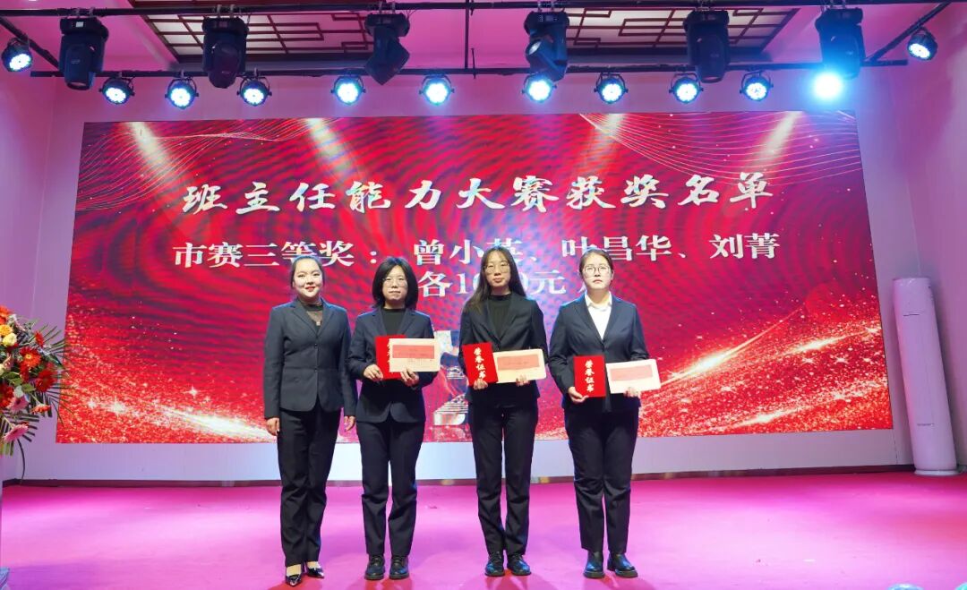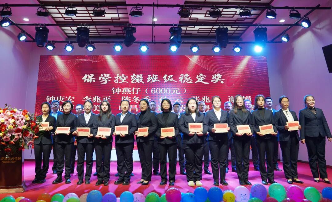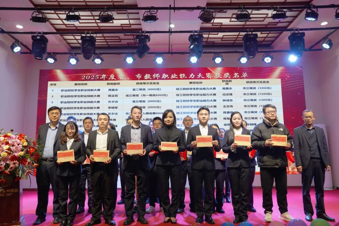 表彰先进树标杆,凝心聚力促奋进。各类荣誉的揭晓见证了全体教职工的责任与担当。姚学林为荣获先进集体颁奖,黄远胜为荣获管理标兵、服务标兵颁奖,陈辰升为荣获优秀教师颁奖,林玲为荣获优秀班主任、荣获市班主任能力大赛人员颁奖,现场还宣读了学校教师参加2025年度省、市教师职业能力大赛获奖名单,陈辰升、姚啸为获奖人员颁奖,徐啟清、林玲为荣获保学控辍稳定人员颁奖,徐东为荣获招生先进系部、个人颁奖,叶翔为荣获实习就业先进系部、个人颁奖,期间各获奖代表登台发言。