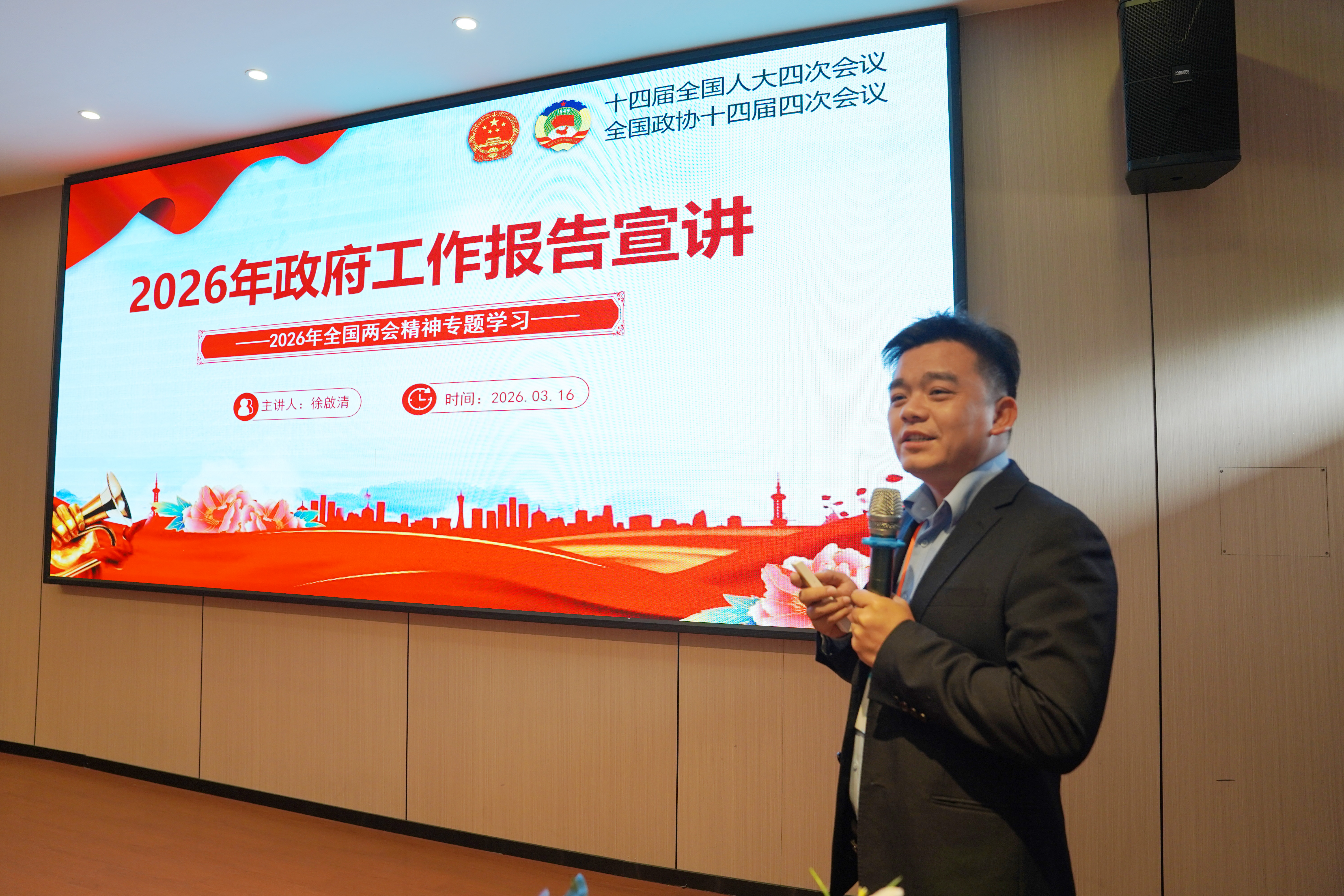 宣讲会上,徐啟清围绕六大核心内容,对2026年全国两会精神进行了全面、系统、深入地解读。他首先介绍了2026年全国两会的基本概况,强调此次两会正值“十四五”圆满收官、“十五五”扬帆启航的关键节点,意义重大、影响深远,为全年发展指明了方向、提供了遵循。